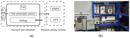 To evaluate the performance of our prototype sensor, an experimental platform is established. As shown in Figure 5, the platform is composed of two parts: Aerosol testing system and aerosol sizing system. In aerosol testing system, the prototype sensor is placed in the aerosol chamber, where the aerosol samples are well stirred by the muffin fans. An air bag is embedded in the chamber to keep particle concentration and air pressure stable. Our prototype sensor was tested with DEHS samples of different SMDs generated by the CMAG-3475 (Condensation Mono-disperse Aerosol Generator, TSI). In aerosol sizing system, SMPS-3936 (Scanning Mobility Particle Sizer Spectrometer 3936, TSI) and APS-3321 (Aerodynamic Particle Sizer Spectrometer 3321, TSI) are used as the reference instruments to measure the concentrations and the SMDs of the aerosol samples.