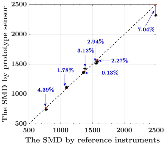 As shown in Figure 6, the experimental results indicate that the maximum measurement error of the SMD is 7.04%, where the horizontal axis is the SMD measured by the reference instruments, and the vertical axis is the SMD obtained by our sensor.