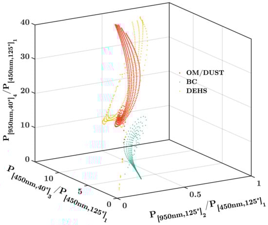 In order to further evaluate the performance of our method for more SMDs, all PM samples listed in Table 2 and DEHS aerosols were tested by the simulation experiments. As shown in Figure 7, the s are mapped in the vector space formed by the 3 ratios, which are calculated from the 4 optical channels. The dots in colors indicate different types aerosol samples. Thus, the SMD can be obtained according to Equation (7).