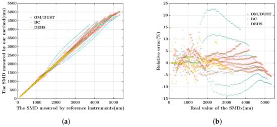 According to Figure 7, we tested the performance of our prototype sensor to measure aerosol samples of different PSDs. As shown in Figure 8a, the horizontal axis represents the ground truth of SMDs, and the vertical axis represents the SMD value retrieved by our method. Compared to BC samples, our method shows better performance for OM, DUST, and DEHS aerosols. According to Equation (9), the combined RSD of all PM samples and DEHS aerosols is 6%. Figure 8b shows the measurement accuracy of each sample, where the horizontal axis is the SMDs of samples, the vertical axis is the relative measurement errors. As shown in Figure 8b, the relative error ranges from −14% to 23% for all aerosol samples including OM, dust, BC and DEHS.