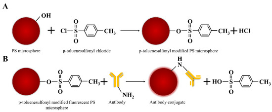 (A) Schematic diagram of p-toluenesulfonyl modified PS microspheres. (B) Conjugation of antibodies to p-toluenesulfonyl modified fluorescent PS microspheres.