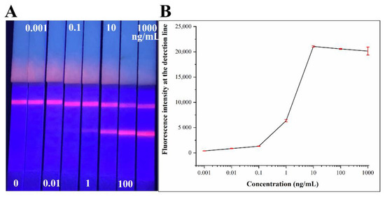 The test results of COVID-19 N protein standards using LFIA strips. (A) Images of corresponding concentrations tested COVID-19 N protein LFIA strips under 365 nm ultraviolet light. (B) Different concentrations of COVID-19 N protein standards measured by the fluorescence strip scanning device.