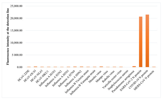 HCoV-229E, HCoV-OC43, HCoV-NL63, HCoV-HKU1, influenza A H1N1, influenza A H3N2, influenza A H5N1, influenza A H7N9, influenza A H9N2, influenza B Victoria strain, influenza B Yamagata strain, Measles virus, Mumps virus, Rubella virus, Varicella zoster virus, Staphylococcus aureus, Pseudomonas aeruginosa, SARS-CoV-2 N protein, and MERS-CoV N protein were used to evaluate the specificity of COVID-19 N protein LFIA strips respectively. After testing, the COVID-19 N protein LFIA strips do not cross-react with other common coronaviruses except SARS-CoV-2 N protein (Figure 7), which was caused by the structural similarity between SARS-CoV-2 N protein and COVID-19 N protein.