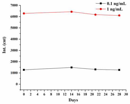 LIFA test strips were tested using standard samples of COVID-19 N protein at concentrations of 0.1 and 1 ng/mL, respectively. Then the test strips were stored at 37 °C for 28 days, and the fluorescence intensity of the detection line was detected on days 14, 21, and 28, respectively. The experimental results are shown in Figure 8. The 28-day aging did not have too much influence on the fluorescence intensity at the detection line of the strip, which indicates that our LFIA strip has good stability.