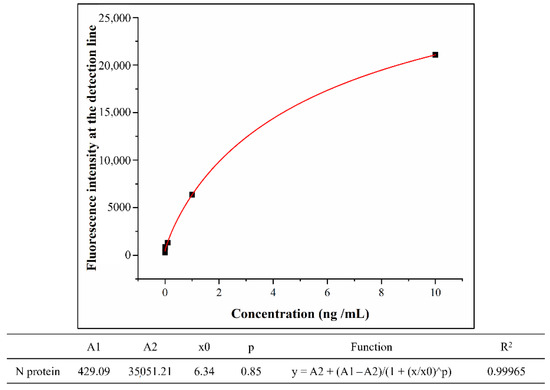 By comparison, our work proved that the nucleocapsid antigen-monoclonal antibody (mAbs) system was more suitable for the immunodetection of the COVID-19. On this basis, a rapid test strip was developed for mass screening of the COVID-19 population. This kind of test strip uses colloidal gold as a probe, and its detection limit is 0.1 ng/mL [19]. In this article, we used p-toluenesulfonyl-modified fluorescent microspheres as fluorescent probes. The p-toluenesulfonyl group improves the coupling efficiency of fluorescent probes and antibodies, eliminating the need for NHS and EDCs as activators and protectors, thus simplifying the reaction steps. Table 1 shows the fluorescence signal intensities of the detection lines on the COVID-19 N protein LFIA strips using the fluorescence test strip scanner to detect different concentrations of COVID-19 N protein standard samples. Obviously, a fluorescence signal that is significantly different from the background noise can be observed on the strip with the standard concentration of 0.01 ng/mL. This proves that the detection limit of the prepared test strip is 0.01 ng/mL, which is 10 times higher than the previous work. In order to further study of quantitative measurement of N proteins, the concentration of N proteins and the corresponding fluorescence intensity were well fitted by the nonlinear equation. The variables satisfy the Logistic function model; the confident function expression is as follows:. The associated parameters are shown in Figure 9. At the same time, the test strip has good specificity, and these advantages make the test strip have great potential in the application of large-scale population screening for COVID-19.