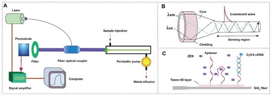 Evanescent wave optical-fiber sensor (EWOF) is a type of portable device based on the evanescent wave generated on the fiber surface when the total reflection of laser inside the optical fiber [,,]. It has the advantages of miniaturization, automation, and low cost, but suffers from low sensitivity when small molecule-binding aptamers are used as recognition ligands. Due to this limitation, the application of EWOF for the detection of mycotoxins, which typically have low contents within a complex food matrix, is limited [,]. Recently, we developed an ultrasensitive evanescent wave optical fiber aptasensor for the detection of small molecules by constructing nanoscale affinity double layer on the fiber (NADL) []. The NADL consists of an aptamer layer and a microextraction layer, which can achieve in situ target purification, detection and in situ target enrichment. We demonstrated the ultrasensitive detection of alternariol spiked in the wheat flour []. The application of EWOF aptasensor for the detection of ZEN has never been achieved.