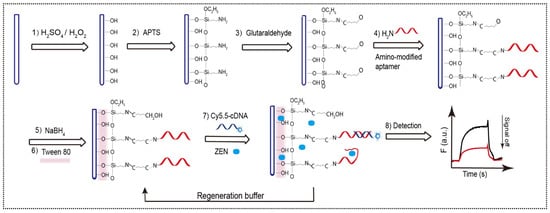 The fabrication and detection process of NADL-EWOF including (1) oxidation by piranha, (2) salinization, (3) linker-coupling to transform the amino group into aldehyde groups, (4) coupling of aptamer, (5) reduction by NaBH4, (6) coating with Tween 80, (7) injection of the mixture containing Cy5.5-cDNA and ZEN, and (8) detection and data analysis.