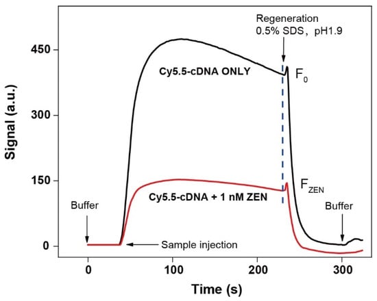 Representative in situ signal responses of the EWOF aptasensor for the detection of 1 nM ZEN (red curve). The black curve is the reference signal in the absence of ZEN (blank sample). The fluorescence intensities of the samples with or without ZEN (FZEN or F0) immediately before the injection of the regeneration buffer (0.5% SDS, pH 1.9) was used to calculate the signal decrease percentage (S% = (F0 − FZEN)/F0).