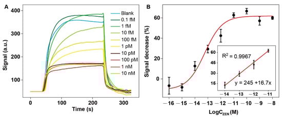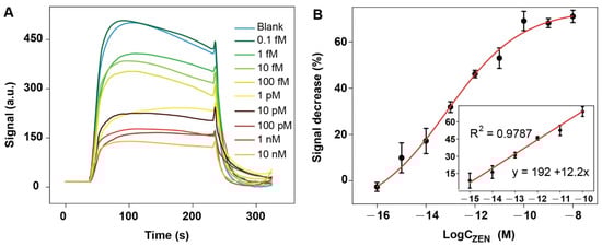 Ultrasensitive detection of ZEN in buffer by NADL-EWOF aptasensor: (A) original response curves for the detection of samples containing ZEN at a wide concentration range; (B) the titration curve generated according to the signal decrease percentage (S%). The fluorescence intensities used for the calculation of the S% were indicated in (A). The error bars in figure (B) are the standard deviations derivatized from the three replicates.