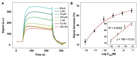 To demonstrate the importance of the Tween 80 layer, we also fabricated the optical fiber without the Tween 80 coating and performed the detection of ZEN using this fiber. The statistically reproducible signal decrease was observed when the concentration of ZEN was 1 pM (Figure 5A). The LOD (S/N = 3) was 2.31 pM. The semilog linear dynamic range was from 1 pM to 1 nM. Comparing to the Tween 80-coated NADL-EWOF aptasensor (Figure 4), the low LOD was about 1000-fold higher, and the linear dynamic range was 100-fold narrower. The results clearly demonstrated the function of Tween 80 for enhancing the sensitivity of the sensor. We also performed the multiple repeated experiments for both aptasensors with and without Tween 80 coating. The reproducibility of the NADL-EWOF aptasensor was excellent, while the EWOF without Tween 80 coating showed limited reproducibility (data not shown).