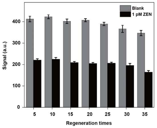 To explore the reusability of the NADL-EWOF aptasensor, we performed reproducibility tests. The 35 cycles of tests were performed, and a test cycle included the sequential injections of the blank sample (cDNA only), 0.5% SDS (pH 1.9), the ZEN sample (1 pM ZEN and cDNA), and the regeneration buffer. The sensor was successfully regenerated for up to 28 cycles (Figure 6) according to the regeneration criteria suggested in the literature []. The good reusability of the aptasensor greatly reduces the detection cost. It also improves the reliability of the results since the repeated measurements could be performed using the same fiber. In fact, every few aptasensors can be reused.