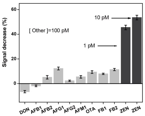Specificity tests against a panel of common mycotoxins. DON: deoxynivalenol; AFB1: aflatoxin B1; AFB2: aflatoxin B2; AFG1: aflatoxin G1; AFG2: aflatoxin G2; AFM1: aflatoxin M1; OTA: ochratoxin A; FB1: fumonisin B1; and FB2: fumonisin B2. All the measurements were repeated three times and the errors were calculated from the three repeats.