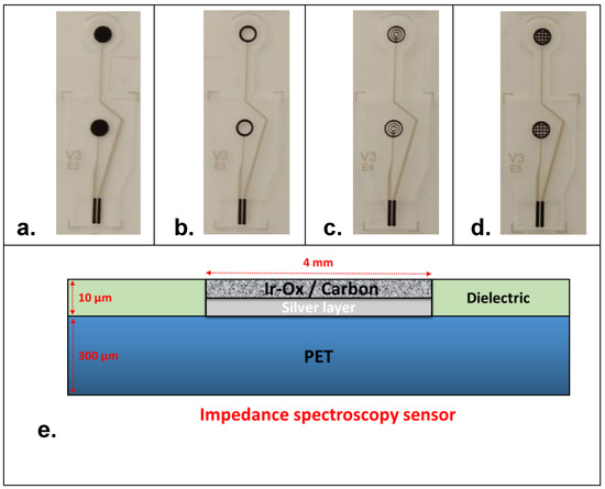 Design of the electrochemical impedance spectroscopy sensors: (a) planar disk-electrodes, (b) ring-electrodes, (c) multi-ring-electrodes and (d) grid-electrodes. (e) Schematic representation in sectional view of the different electrodes layers. Thickness of the screen-printed layers is given as an approximation according to the meshing of the screen and the printing parameters.