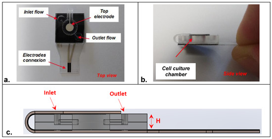 Design of the embedded microfluidic cell-culture chamber integrating the impedance sensors in (a) top view and (b) side view. (c) Schematic representation in section view of the assembled impedance sensors (H represents the depth of the cell-culture chamber).