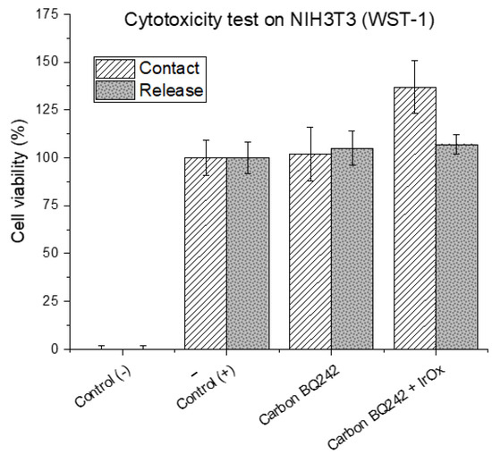 Cytotoxicity testing on NIH3T3 cells (WST-1) of electrode’s materials (carbon BQ242 and carbon BQ242 + IrOx 2 wt%). Values of cell viability (in %) represent the average absorbency (n = 3) ± SEM, relative to positive controls (+) cultures (without any contact with any materials). Negative controls (−) correspond to the cultures where cells are exposed to hydrogen peroxide (H2O2, 10 mM), in which no cell growth and proliferation is expected (dead cells control).