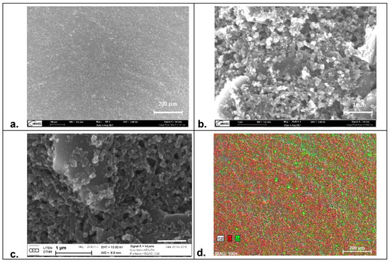 Figure 4a,b show the recorded SEM images for the modified-carbon ink at different magnification levels of 100× and 20k×, respectively. Compared to the recorded images of the unmodified-carbon ink (Figure 4c), both surfaces show regular shapes with an unaffected morphology by the presence of IrOx particles. No cracks were observed on the electrode’s surfaces. Some aggregates of carbon particles were shown in both cases, whereas the particle size was around ~1 µm. Concomitantly, the mapping of carbon (in red) and iridium (in green) elements by EDX analysis (Figure 4d) shows that IrOx particles were uniformly distributed on the electrode’s surface. This reflects the homogeneity of the prepared paste and the high accessibility of IrOx particles on the surface. Based on this evaluation, the registered images demonstrate that the addition of IrOx particles does not change the microstructure of the electrode; however, it helps to maintain standard morphology with an enhanced interfacial behavior of the electrode.