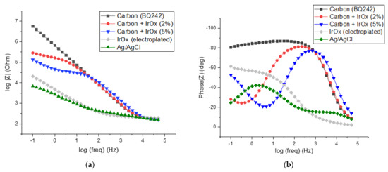As expected, the Ag/AgCl electrode presented low interfacial impedance as well as a low cut-off frequency (around 100 Hz, Figure 5a). Moreover, the phase diagram of the bode plots shows a phase shift angle of lower than 40 degrees which indicates low capacitive behavior and a high availability of chloride ions ([Cl−] ≈ 0.014 M, Figure 5b). This behavior is typical for purely non-polarizable electrodes and is due to the reversibility of the silver/silver chloride redox reaction. On the opposite side, carbon-based electrode (BQ242) exhibits a higher cut-off frequency (around 1 kHz). As expected, the impedance of carbon materials at high frequencies (>cut-off frequency) that address the resistance of the electrolyte was similar to that of Ag/AgCl [38,39]. Down to 10 kHz, the impedance module decreased linearly with the log of frequency taking values that exceed the Ag/AgCl impedance by 2 to 3 orders of magnitude. Concomitantly, the phase of the carbon electrode reached an angle of 90° which is consistent with purely capacitive behavior. This comportment typically corresponds to a purely polarizable electrode.