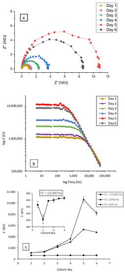 Impedance measurements (disk design, carbon BQ242 + IrOx 2 wt% electrodes) during 6 days of culture under flow rate of 7 µL·min−1: (a) Nyquist plots, (b) Bode plots and (c) impedance (Z) as function of the culture day and zoom on the plot at frequency of 10 kHz. Frequency scanning range of 50 kHz–5 Hz. Cells were exposed to SDS at a final concentration of 0.5 mM after the TEER measurement of day 5.