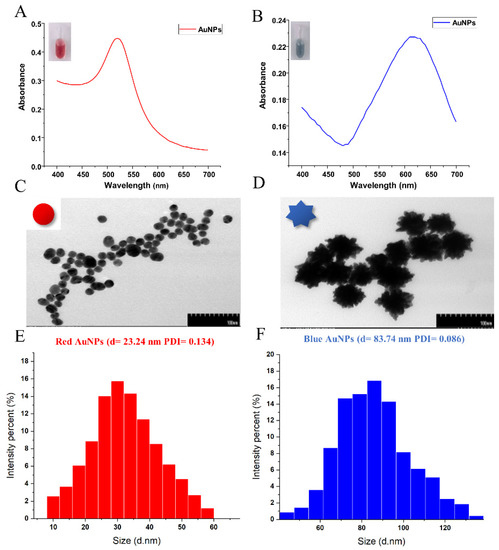 Characterisation of the optical properties, shapes and sizes of red and blue AuNPs. (A,B) UV–vis absorption spectra of two-colour AuNPs. Inset: the relevant photographic images of the synthesised AuNP solution. (C,D) TEM images. Inset: the structural diagrammatic presentation of synthesised AuNPs. (E,F) Hydrodynamic diameter. PDI indicates the polydispersity index.