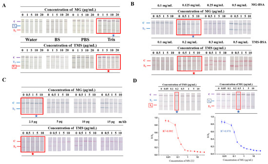 Optimisation results of different conditions. (A) Loading buffer solution. (B) Concentration of coating antigens of TMS-BSA and MG-BSA. (C) The amount of mAbs used to prepare AuNP probes for TMS and MG. (D) Single detection sensitivity of TS-DTL, (left) for TMS, (right) for MG. ★: Red and blue pentagrams indicate the qualitative limit of TMS and MG, respectively.