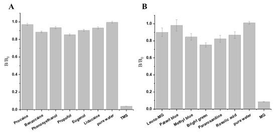 Specificity evaluation of TS-DTL for the detection of TMS and MG. (A) Specificity test of TMS and 6 other anaesthetics; (B) Specificity test of MG and 6 other dyes.