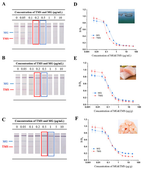 In general, TMS and MG are dissolved in water to keep aquatic products fresh and lively during aquaculture transportation. Therefore, the sensitivity of TS-DTL for the simultaneous detection of TMS and MG was investigated by three types of aquatic matrices (aquaculture water, fish and shrimp), which were spiked with TMS and MG at various concentrations (0~10 μg/g spiked in fish and shrimp, 0~10 μg/mL spiked in aquaculture water). As shown in Figure 4A–C, the colour of the T lines gradually faded with increasing concentrations of TMS and MG, while the red T1 line (TMS) was almost invisible at 0.2 μg/mL for aquaculture water and 0.5 μg/mL for fish and shrimp, which could be determined to be a qualitative limit. The blue T2 line (MG) disappeared at 0.5 μg/mL for aquaculture water and fish and 1.0 μg/mL for shrimp, which was determined to be qualitative sensitivity. For the aquaculture water, the quantitative sensitivity of TMS and MG was calculated to be 11.0 ng/mL and 47.0 ng/mL, respectively (Figure 4D). For the quantitative LOD of aquatic product samples, the detection limits of TMS and MG in fish were 29.6 ng/mL f and 82.8 ng/mL, respectively (Figure 4E), while the LOD of shrimp was 61.4 ng/mL for TMS and 152.4 ng/mL for MG (Figure 4F).