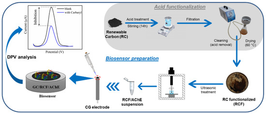 For the first, the electrochemical biosensor GC/RCF/AChE was characterized and applied in the detection of carbaryl in apple samples. This provides a reference/guideline for utilizing a renewable carbon-based material, derived from residues, with low complexity for their synthesis and characterization. Moreover, the results expand the applications of renewable carbon towards the development of novel electrochemical sensors.
