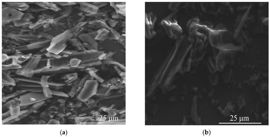 The surface morphologies of RC and RCF were characterized by SEM, as displayed in Figure 2. Significant changes after acidic treatment were evaluated. As seen in Figure 2a, the typical structure of the untreated RC sample shows a heterogeneous form, with particles of random sizes and pores or honeycomb structures [27]. In Figure 2b, the RCF presents a noteworthy change in the structure of the material, with a decrease in pore volume and grooves on its surface. Similar observations have been reported in previous studies [28].