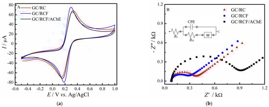 The EIS experiments showed in Figure 3b are in accordance with the previous CV. The EIS experiment revealed that the resistance to charge transfer (Rct) for the electrodes was altered as the biosensor was fabricated. The GC/RC (▲) showed a Rct of 311 Ω, after the functionalization step, the GC/RCF (●) electrode showed a decrease in the resistance charge, leading to a value of 257 Ω. Furthermore, the biosensor GC/RCF/AChE (■) showed a Rct of 818 Ω, which is expected due to the presence of a poor conductor as an enzyme [7].