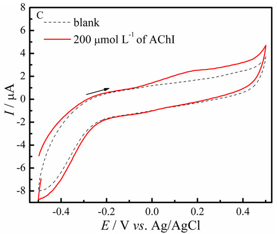 As reviewed in the literature, the AChE biosensor acts by exploring the inhibition of enzymatic activity by pesticides, predominantly by the carbamates and organophosphates classes [29]. The electrochemical characterization of the GC/RC/AChE biosensor in the presence of the substrate acetylthiocholine iodide (AChI) was carried out by CV experiments in 0.1 mol L−1 of PBS (pH 7.0). Figure 4 shows the voltammetric responses of the biosensor in the absence (dashed line) and in the presence (solid black line) of 200 μmol L−1 of AChI. In the absence of the substrate no electrochemical process was observed. On the other hand, in the presence of AChI (solid line), the proposed biosensor presented an oxidation peak at Epa = +180 mV vs. Ag/AgCl/KCl (3.0 mol L−1). The investigation of this oxidation mechanism will be discussed next.