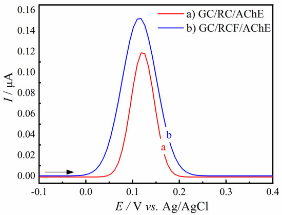 DPV responses of GC/RC/AChE (a) and GC/RCF/AChE (b) biosensors in the presence of 50.0 µmol L−1 of AChI substrate in a 0.2 mol L−1 PBS solution pH 7.5.