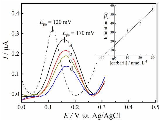 The efficacy of carbaryl detection of GC/RCF/AChE biosensor was evaluated by the DPV voltammograms. The analytical curve was based on the difference of the oxidation current of thiocholine before and after adding different carbaryl concentrations, as described in the experimental section. The biosensor showed a linear response from 5.0 to 30.0 nmol L−1 as shown in Figure 8. Following the equation, I (%) = 1.5 × 10−4 + 2.62 × [carbaryl], with a correlation coefficient of R2 = 0.982 (n = 6). Following IUPAC recommendations, the limit of detection (LOD) of 4.5 nmol L−1 (0.91 ng mL−1) and a LOQ of 15.0 nmol L−1 (3.02 ng/mL). The developed method showed a sensitive response for carbaryl. The Brazilian Health Regulatory Agency (ANVISA) states that the maximum residue level (MRL) for apple crops is 2.0 mg/kg, and the Acceptable Daily Intake (ADI) is 0.003 mg per kg of body weight [6]. Considering the high toxicity and teratogen aspects of carbaryl, the development of biosensors able to detect this carbamate pesticide at low concentrations is fundamental.
