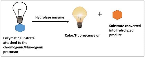 As an alternative to conventional culture plating, chromogenic/fluorogenic media have been developed, which eliminate the need for subcultures and further biochemical tests for pathogen identification [29]. They detect, isolate, and differentiate specific fungal or bacterial pathogens from a sample containing a heterogeneous population of microorganisms. The detection of pathogenic bacteria and molds through chromogenic/fluorogenic media requires a very small amount of sample, and it detects pathogens through color formation or fluorescence in either culture broth or agar media [30,31]. The color formation or fluorescence is observed when chromogenic or fluorogenic substrate is hydrolyzed into a colorful or fluorescent product by the unique enzyme, expressed by the microorganism (refer to Figure 1) [32]. The enzyme activity is usually not species-specific; therefore, complementary or secondary enzymatic activity or selective agents are used for the species under investigation. The selective agents (usually antibiotics) used in chromogenic media provide both positive and negative selection to facilitate the growth of microorganisms and also inhibit the growth of other non-target microorganisms in the sample matrix [33]. This approach of bacterial selection and detection can be at more than one level where more than one unique chromogenic enzyme and selective agent are employed for better identification and specificity [34]. The bacterial hydrolases (β-glucosidase or β-galactosidase) are the most common enzymes that are targeted because of their chromogenic substrates [35,36]. These chromogenic substrates provide a bright color after reaction by the bacterial enzyme and differentiate the colonies on the basis of the presence of a targeted enzyme.