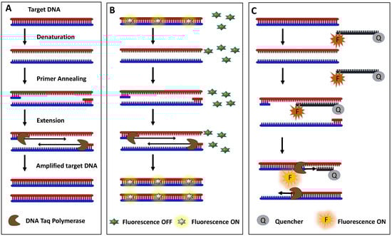 A simple qPCR also contains fluorescent dye or a DNA probe that facilitates the quantification of amplified DNA, along with nucleotides, thermostable DNA polymerase, and a sample. Ethidium bromide, SYBERGold, and SYBERgreen are some examples of some intercalating dyes, whereas TaqMan and Molecular Beacon probe are some examples of commercial DNA probes for the quantification of the amplified product [63,64]. Figure 2 explains the working process of some commercial DNA probes. These fluorescent dyes and DNA probes are being used to quantify amplified DNA after the amplification reaction in real time. qPCR is capable of detecting a minute number of target cells in a sample of non-specific cells and debris [65]. In a qPCR, if RNA is being used as a target nucleic acid, an enzymatic reverse transcription step is added to make complementary DNA (cDNA) from the RNA prior to the amplification [61]. This type of PCR is called reverse transcriptase PCR (RT-PCR). The limitation of qPCR is the use of expensive instruments such as thermal cycle and real-time amplification monitoring devices and trained personnel.