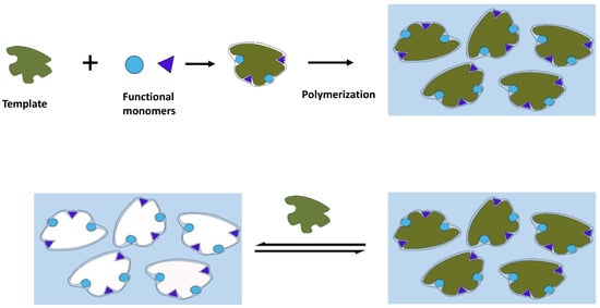Molecular imprinting is a comparatively new technique that comprises the integration of molecularly imprinted polymers (MIPs) with different transducer platforms such as optical, electrochemical, and mass-sensitive transducer platforms [75,76,77]. This technology can offer highly selective and sensitive detection of pathogens in an ultra-rapid manner [78]. MIPs are artificial receptors that are prepared by the polymerization of monomers and crosslinkers along with other initiators and porogens (if required). During this process, the presence of target analyte works as a template and can be further removed to create free cavities in MIPs with conserved shape, size, and functionality (refer to Figure 3) [79]. Therefore, MIPs can easily recognize the target analyte in the sample and can easily discriminate it from other co-existing structures through a combination of size, morphology, and different chemical interactions (such as covalent, semi-covalent, and non-covalent).