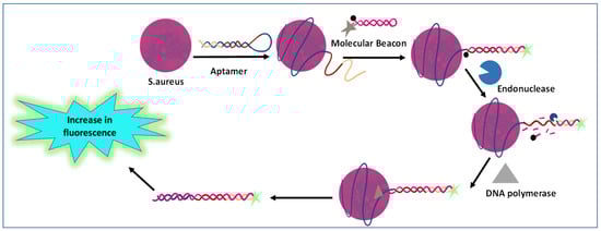 Schematics representing detection of Staphylococcus aureus (S. aureus) using specific aptamer, a fluorescent molecular beacon, and signal amplification. The chimera aptamer sequence forms a hairpin structure with aptamer sequence of S. aureus. In the presence of bacterial pathogens (i.e., S. aureus), it becomes bound to aptamer region of chimera sequence, which results in opening of hairpin structure and unlocking of molecular becon, restoring the fluorescence [98].