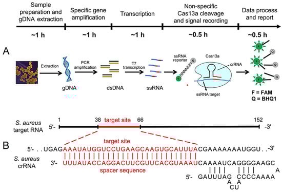 - Zhou, J.; Yin, L.; Dong, Y.; Peng, L.; Liu, G.; Man, S.; Ma, L. CRISPR-Cas13a Based Bacterial Detection Platform: Sensing Pathogen Staphylococcus Aureus in Food Samples. Anal. Chim. Acta 2020, 1127, 225–233. [Google Scholar] [CrossRef]