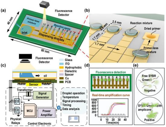Detection of foodborne pathogens using digital microfluidic chip with loop-mediated isothermal amplification (a) schematic of digital microfluidic chip, (b) chip with primers (both dried and rehydrated), (c) side view of the chip along with representation of control system, and (d) results of on-chip loop-mediated isothermal amplification (LAMP) reaction, and (e) schematic of LAMP results with dye. Reprinted/adapted with permission from Ref. [122]. 2022, Elsevier.