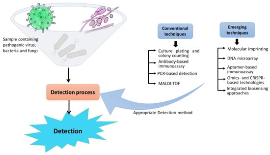 For pathogen detection, the conventional approaches identify the precise biochemical and microbiological constituents. Different types of conventional approaches are discussed in this section, such as culture-based methods, antibody-based immunoassay, PCR, and MALDI-TOF mass spectrometry. In the case of culturing techniques, the specific pathogens are identified on the basis of the growth of the microorganisms [22]. Immunoassays involve the quantitative reaction of an antigen with its antibody [23]. PCR is a nucleic acid-based detection technique, whereas MALDI-TOF matches the masses of biomarkers of unknown microorganisms with the proteome database [24].
