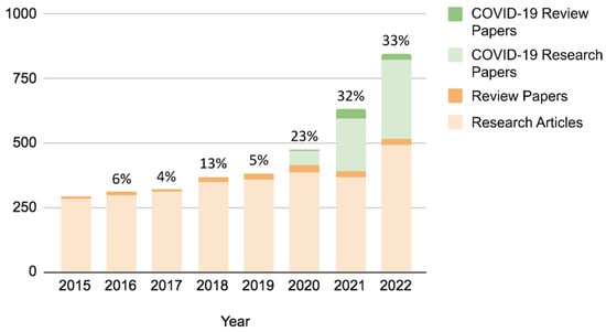 To understand how interest in LAMP grew as SARS-CoV-2 progressed, we used Scopus (Elsevier) to analyze the journal papers on LAMP pre- and post-pandemic. We first narrowed our search to journal publications between 2015 and 2019, searching keywords: “LAMP” or “loop-mediated isothermal amplification.” Results included the total number of research papers and review papers related to LAMP published in journals. Next, we conducted an identical search but switched our years of interest to 2020 through 2022. In the years preceding the pandemic, a steady growth (4–13%) in LAMP interest is seen (Figure 1). However, publications began to surge exponentially (23–33%) following the COVID-19 pandemic. In fact, in 2021 and 2022, over one-third of LAMP-centered publications were focused on SARS-CoV-2 testing (Figure 1).