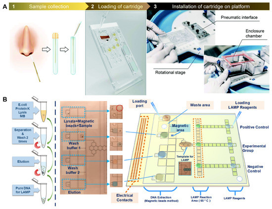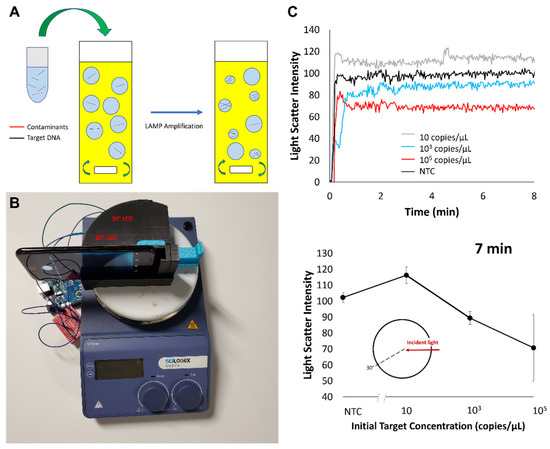 Promising LAMP platforms can also be seen in emerging research, especially, in recent years, in response to the COVID-19 pandemic. In 2019, a research group from the National University of Singapore developed a smartphone-based colorimetric LAMP device that yields results within an hour. The system utilizes a syringe filter with magnetic beads for rapid DNA extraction and is 10 times more specific than PCR methods (Figure 6A) [105].