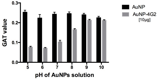 To prepare our biosensor, citrate-coated AuNPs of 60 nm were conjugated by adsorption with a 4G2 antibody. First, we determined the optimal conditions for the conjugation process. For this purpose, the pH of the nanoparticle solution was adjusted from 5 to 10. After that, AuNPs were conjugated with a final antibody concentration of 10 µg/mL (maximum concentration of antibody). The optimal pH for conjugation was determined by measuring the aggregation capability of the conjugated AuNPs. Each AuNP–antibody conjugate was incubated with a 20% NaCl solution where the saline environment generates negative charges in the medium and increases the interactions between AuNPs with negative charges available on their surface (not completely covered by the antibody), resulting in the aggregation of the AuNPs and the formation of agglomerates. If the conjugation conditions did not allow the antibodies to bind to the surface of the AuNPs and cover it completely, aggregates will be generated in the presence of sodium chloride. The formation of these aggregates was measured in each condition tested during the conjugation process by the gold aggregation test (GAT). In this test, they measured the absorbance values at 534 and 600 nm before and after the addition of NaCl to the AuNP solution (at different pH values) after conjugation with the antibody. The values were used to calculate the number of GATs from the formula established by Chamorro et al. [26]; the lower the value of the GAT number, the better the coating of the surfaces of the nanoparticles with the antibodies, indicating the best condition for conjugation.