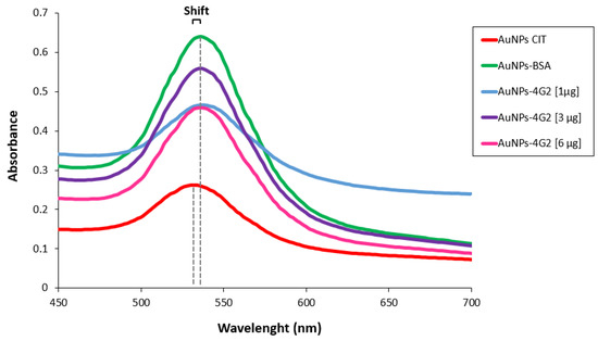 It was observed that the three AuNP–4G2 conjugates in the spectral scan UV-visible range presented a shift in the maximum absorbance peak compared to the naked AuNPs. This shift in the maximum absorbance peak of the conjugates has been previously reported as being indicative of the adsorption of the antibodies on the surface of the AuNP forming a monolayer [42].