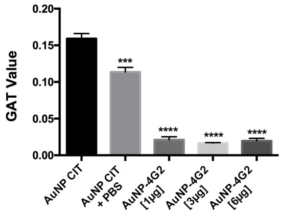 We compared the AuNP control and conjugates using one-way analysis of variance (ANOVA) and Tukey’s multiple-comparison post-test. Differences between groups were significant at a p value of <0.05. Statistical analyses and graphics were made with GraphPad Prism 6.0 (GraphPad Software, Inc., San Diego, CA, USA).