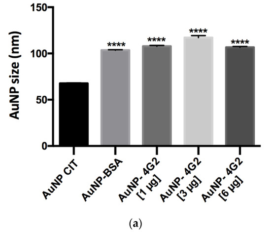 For the physicochemical characterization, dynamic light scattering (DLS) was used to determine the hydrodynamic size, ζ-potential, and state of aggregation of the AuNPs and conjugates. The values of each measured parameter can be seen in Table S2 in the Supplementary Materials.