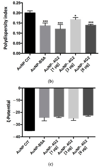 Physicochemical analysis of AuNPs and conjugates by DLS. (a) Hydrodynamic diameter (size), (b) polydispersity index, and (c) ζ-potential values of the naked AuNPs (AuNP CIT), control (AuNP–BSA), and conjugates (AuNP–4G2) (* p < 0.05, *** p < 0.001, **** p < 0.0001, n = 3).