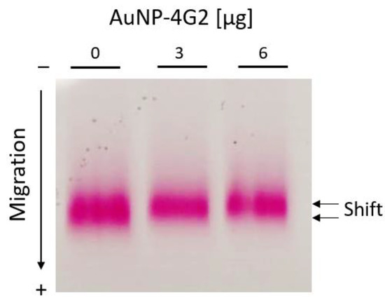 Electrophoretic mobility shift assay for AuNP–BSA and AuNP–4G2 conjugates. Agarose gel electrophoresis was used to identify the migration differences of each conjugate of AuNPs with increasing concentrations of anti-flavivirus antibodies (0, 3, and 6 µg/mL).
