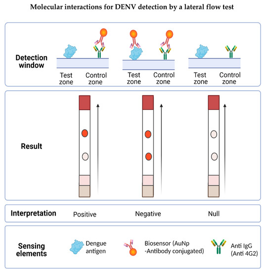 Molecular interactions involved in the possible results obtained in the LFA. The detection window is made up of the test zone and the control zone. In the first, the DENV is immobilized whereas in the second, the secondary anti-IgG antibody is immobilized. When placing the sample, the flavivirus present interacts with the biosensor forming a complex, which prevents it from joining the test zone but is recognized by the control zone, obtaining a positive result (a signal). If the sample does not present the antigen to be detected, the biosensor flows to the detection window and forms a complex with the virus present in the test zone, also binding to the antibody in the control zone, obtaining a negative result (two signals). Results will be null when the test zone has no signal, indicating that the biosensor did not flow properly on the LFA.