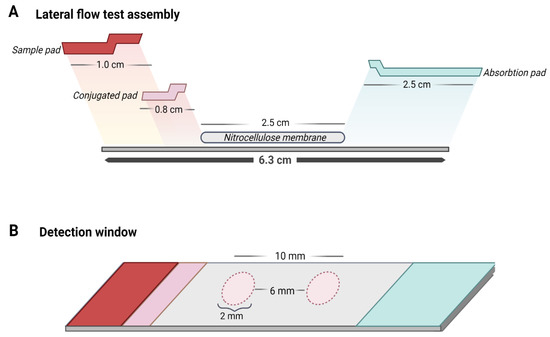 Design of the lateral flow assay for the detection of flaviviruses. (A) From left to right, the strip is composed of a sample pad, conjugate pad, detection membrane (with a test zone and a control zone), and absorbent pad. Each of the overlapping components as shown in the image have specific measurements that allow the flow in the strip for the formation of biosensor–virus complexes for detection. (B) The detection membrane is formed by the test zone and the control zone, where each one has a defined size that makes it possible to observe the results with the naked eye and the separation between them, with a constant measure, ensures the results of both zones do not overlap.