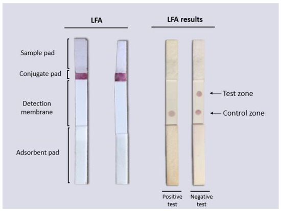 Among the different types of POCT, lateral flow assays (LFAs) are the simplest as they are easy to use without the need for specialized equipment. LFAs are paper-based chromatographic tests in which detection reagents are preloaded and activated when the sample is added, obtaining results in approximately 15 min. LFAs use gold nanoparticles (AuNPs) as labeling molecules that are functionalized with biological recognition elements to form specific biosensors that capture the antigens of interest to carry out the detection.